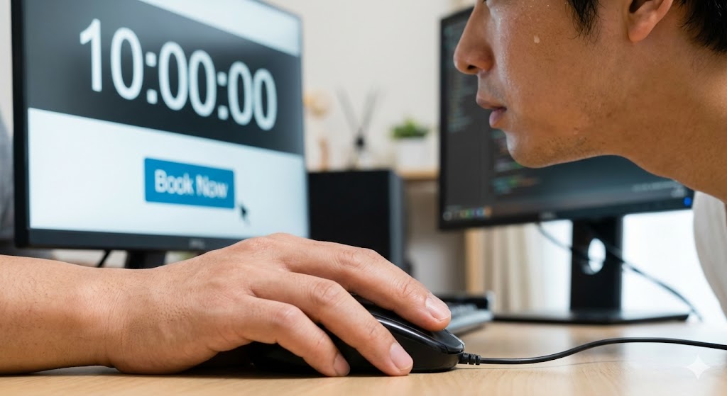 まず、戦いに挑む前の「機材」選びから勝負は始まっています。結論から言うと、操作の確実性と通信速度の安定面から、私は「有線LAN接続されたPC」での参戦を最も推奨しています。スマホの4G/5G回線も2026年現在は非常に高速ですが、電波の揺らぎや通知による割り込みのリスクがゼロではありません。PCであれば、複数のブラウザタブを駆使して状況を把握しやすく、かつキーボードショートカットを用いた高速な画面更新が可能です。