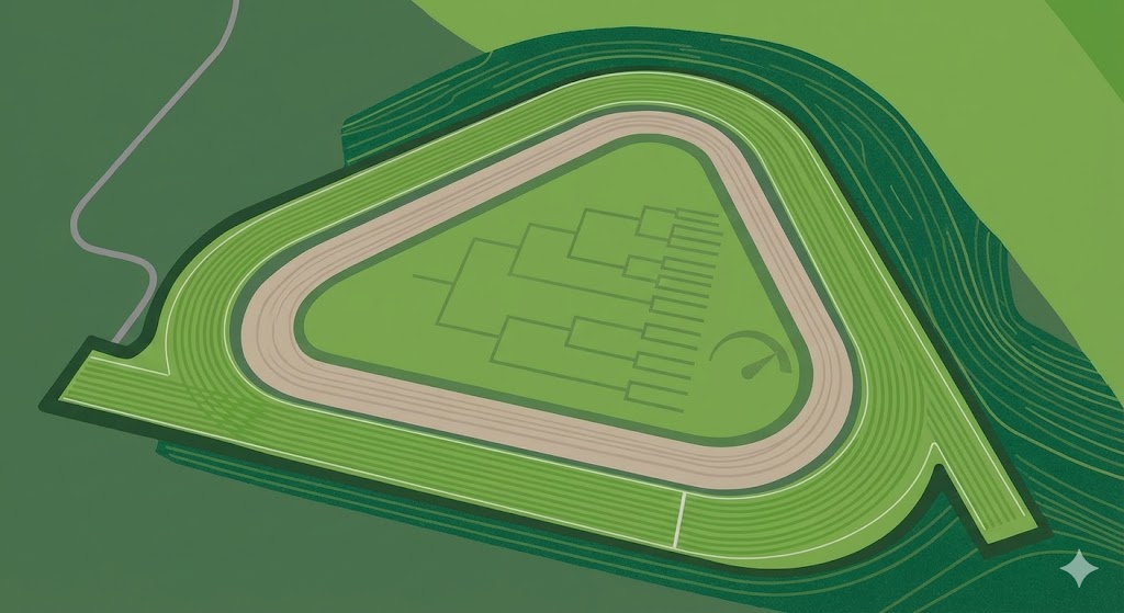 中山芝2200mの外回りコースは、JRAの全コースの中でも屈指のトリッキーさを誇る「おむすび型」をしています。スタート地点は向正面の入り口付近で、そこから最初のコーナーまでは約400メートル。一見、先行争いが激化しそうに見えますが、スタート直後には高低差2メートル以上の急坂が待ち構えており、これが馬たちの脚色を強制的に抑制します。この「初手の坂」でリズムを崩す馬も多く、序盤のポジション取りが非常に難解なコースと言えるでしょう。