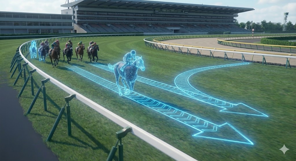 中山2500mという舞台は、JRAの中でも屈指の特殊なレイアウトを持つコースです。AIはこの「物理的な舞台設定」と「馬のDNA」の相性を非常にシビアに評価します。シミュレーションにおいて、まず真っ先に修正されるのが枠順確定後の評価ポイントです。スタート地点が第3コーナーの手前という変則的な位置にあるため、外枠に入った馬はスタート直後から距離ロスを強いられ、その「スタミナ消費量」がAIによって自動的にマイナス加算されます。