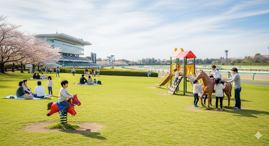中山競馬場の非開催日の魅力は、競馬ファンだけのものではありません。むしろ、その真価は家族連れやカップルが楽しめる広大な公園としての側面にあります。こちらも入場は無料で、気軽にピクニック気分で訪れることができます。