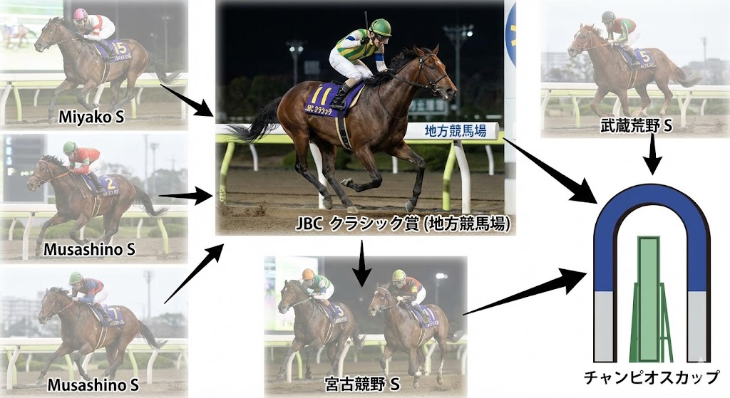 馬の「鮮度」と「疲労」を見極める上で、前走ローテーションの分析は避けて通れません。結論から申し上げますと、チャンピオンズカップにおいて最も信頼度が高く、王道とされるのは間違いなく「JBCクラシック組」です。