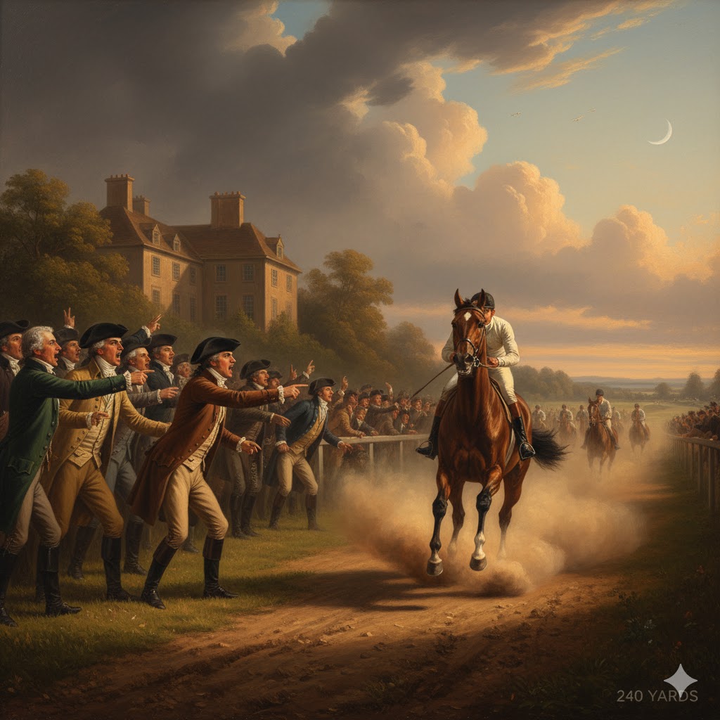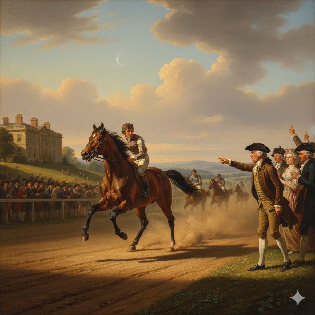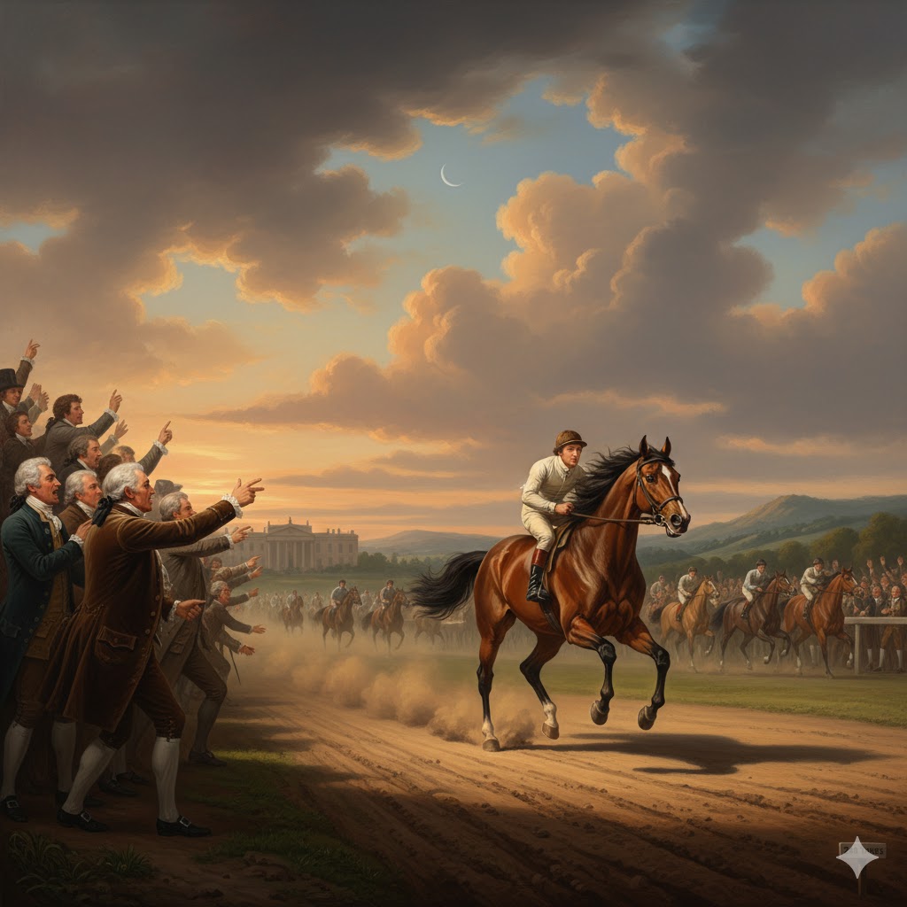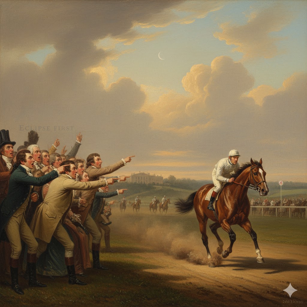 1769年5月、エプソム競馬場で行われたレースがエクリプスの初出走でした。当時のレースは複数回走る「ヒート制」が主流で、エクリプスは第1ヒートをいとも簡単に圧勝します。それを見たプロのギャンブラーであり、後にエクリプスの共同所有者となるデニス・オケリー大佐が、第2ヒートの全馬の着順を予言する賭けを申し出ました。