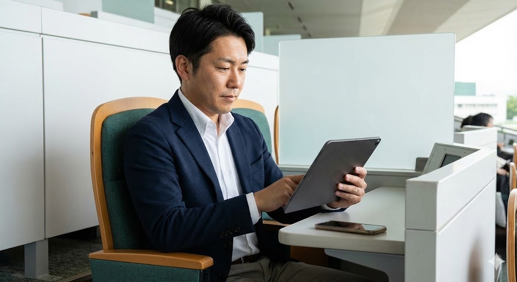地味ですが、絶対に持っていくべきなのが「折りたたみ式のタブレットスタンド」です。6時間以上も端末を手で持ち続けるのは腕が疲れますし、テーブルに平置きすると照明が反射して見づらくなります。100円ショップのものでも良いので、角度調整ができるスタンドがあると、そこがまさに「コックピット」になります。