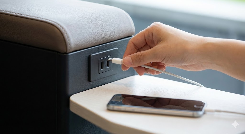 リニューアル後の座席設備ですが、多くの席で設置されているのは一般的な「AC電源(コンセント差込口)」のみで、USBポート(Type-AやType-C)が直接挿せる仕様にはなっていない可能性が高いです(一部エリアを除く)。そのため、充電ケーブルだけでなく、必ず「ACアダプタ(充電器本体)」を持参してください。これがないと、せっかくの電源設備もただの穴になってしまいます。