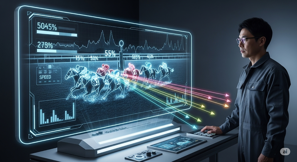 ディープラーニングを分かりやすく例えるなら、「競馬を熟知したAIの専門家が、過去数万レースの映像を全て見て、人間では気づけないような微細な勝ちパターンを自ら学習する」ようなものです。単なる着順データだけでなく、レース中の馬の位置取りやペース、走り方の癖といった特徴量までをAIが自動で発見し、予測に反映させています。
