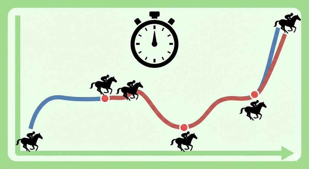 私が想定しているのは、前半の3ハロンが35.0〜35.5秒程度の「ややスローから平均ペース」です。スタート後の直線が長いため、先行争いは比較的スムーズに決着し、淀の坂に差し掛かるあたりで一度12.5秒〜13.0秒くらいまでラップが緩みます。ここが「中緩み」の区間ですね。ここで後続が動かなければ、前の馬たちは息を整えることができ、ラスト3ハロンの瞬発力勝負に向けてパワーを温存することになります。