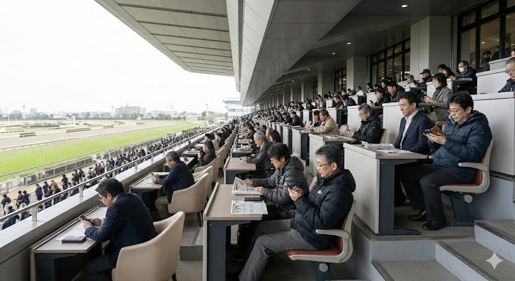 「やっぱり馬券は紙で手に持って応援したい」という層や、デジタル操作に抵抗がある層が一定数このエリアを避けるため、理論上は全席種解放時よりも競争率が分散されるはず……なのですが、現実にはその影響を上回るほどの「屋内需要」が勝っています。特に2月の寒さは、紙の馬券へのこだわりを捨てさせるほどの威力がある、というのが正直なところかなと思います。むしろ、UMACAを使いこなす感度の高いファン同士の、より密度の高い争奪戦が繰り広げられているのが現状です。