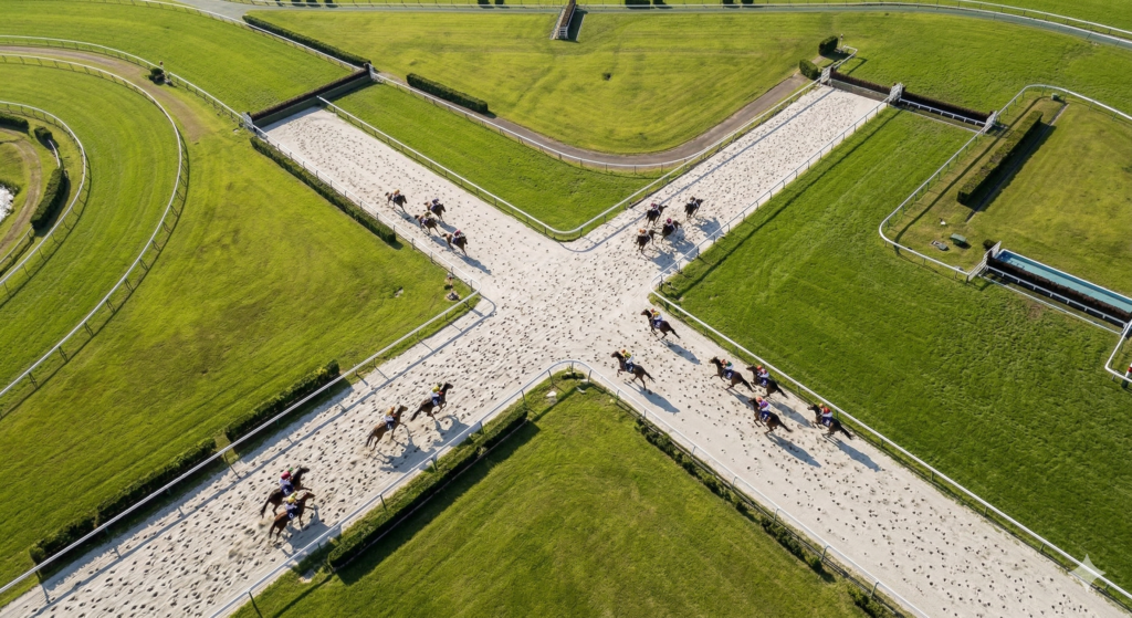 中山グランドジャンプのコース図を俯瞰した際、誰もが最初に目を引かれるのが、コースの中央部で「X」の形に美しく、かつ不気味に交差する道ではないでしょうか。これが中山競馬場が誇る「襷(たすき)コース」と呼ばれる特殊な区間です。この襷コースを通過することは、単なるルートの変更を意味するのではなく、レース中に馬の進行方向が180度入れ替わる「逆回り」への突入を意味します。通常の平地競走や他の障害レースが同一方向への旋回で完結するのに対し、中山グランドジャンプは「順回り(右)→逆回り(左)→順回り(右)」という、極めて変則的でテクニカルな動線を辿ります。この複雑なプロセスこそが、このレースの難易度を「世界一」の域へと押し上げている大きな要因の一つなのです。