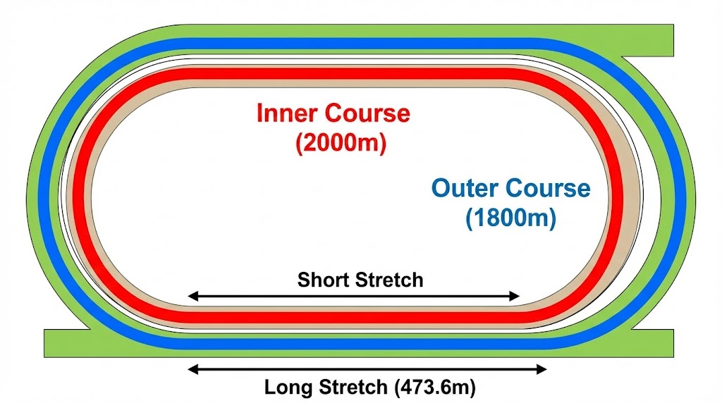 距離短縮に伴うもう一つの、そして極めて重大な変更点が「コース形状」です。阪神競馬場の芝2000mは「内回りコース」を使用しますが、芝1800mは「外回りコース」を使用します。この違いは決定的です。
