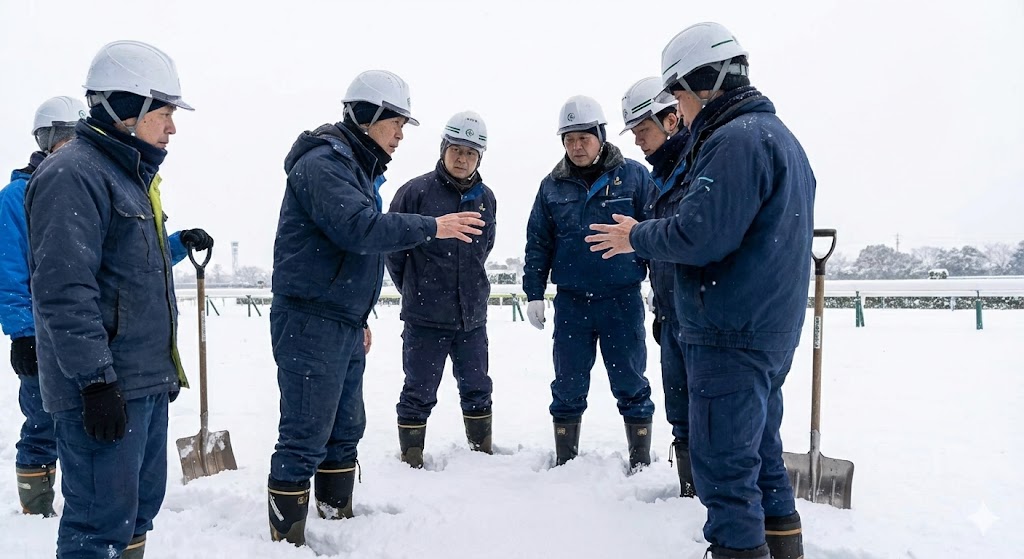 具体的な判断基準としては、開催前日の夕方の時点で、翌日の降雪確率が一定以上あり、なおかつ気温が氷点下まで下がる予報が出ている場合です。単に雪が降るだけでなく、「路盤が凍結して馬の安全が確保できない可能性」が1%でもあると、JRAは保守的な判断を下します。芝コースは非常に繊細で、雪が少し積もった状態で馬が走ると、芝の根が傷むだけでなく、蹄が滑って転倒事故に繋がる恐れがあるからです。これは馬だけでなく、ジョッキーの命を守るための厳格なルールなんですね。