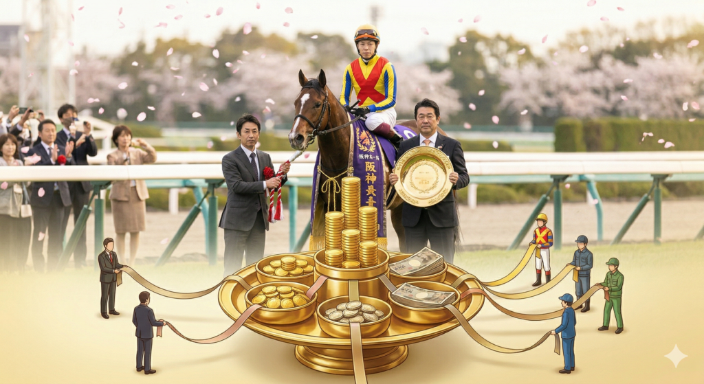 獲得した賞金がすべて馬主さんのものになるわけではない、というのは競馬ファンの間では有名な話ですよね。一緒に戦ったチームへの報酬として「進上金」が自動的に天引きされます。2026年の桜花賞(平地競走)における分配比率は、JRAの規定および慣例によって以下のように明確に定められています。