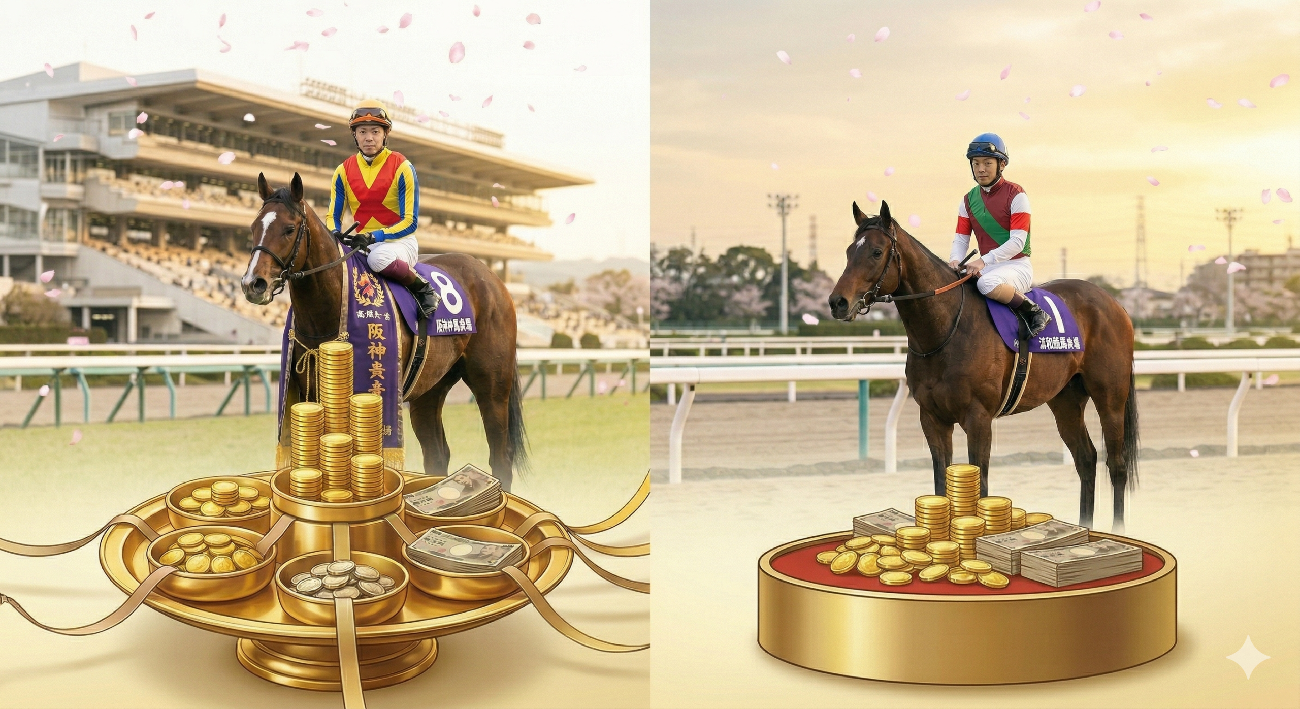 浦和の桜花賞の1着賞金は3,000万円。地方競馬としてはトップクラスの賞金額ですが、JRAの桜花賞と比べると約4.7倍もの開きがあります。この圧倒的な資金力の差が、世界中から有力な馬や騎手が集まるJRAの魅力を支えている一因なのは間違いありません。ただ、地方の桜花賞を勝った馬は、その後の交流重賞などでJRAの強豪と戦い、さらに大きな賞金を積み上げていくチャンスも持っています。中央と地方、それぞれの桜花賞には異なるドラマと経済圏があるんだなと感じますね。