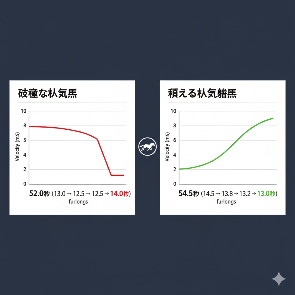 「粉飾調教」のセクションで、「全体時計は速いが、最後はバテている(失速ラップ)」という危険なパターンを見ました。人気薄馬を狙う場合は、その逆です。