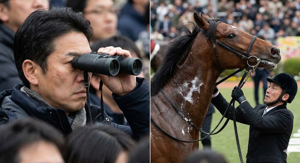 パドック診断において、私が最も注意深く、かつシビアにチェックしているのが「白い汗(泡を吹くような発汗)」の有無です。シンザン記念の開催時期は、1月の厳寒期。本来であれば馬も体温を逃がさないように血管を収縮させている時期ですから、人間と同様、ただ歩いているだけで汗をかくことはまずあり得ません。それにもかかわらず、首筋や股の間に白い泡状の汗がびっしょりと付いている馬は、明らかに異常な興奮状態、いわゆる「イレ込み」の状態にあります。