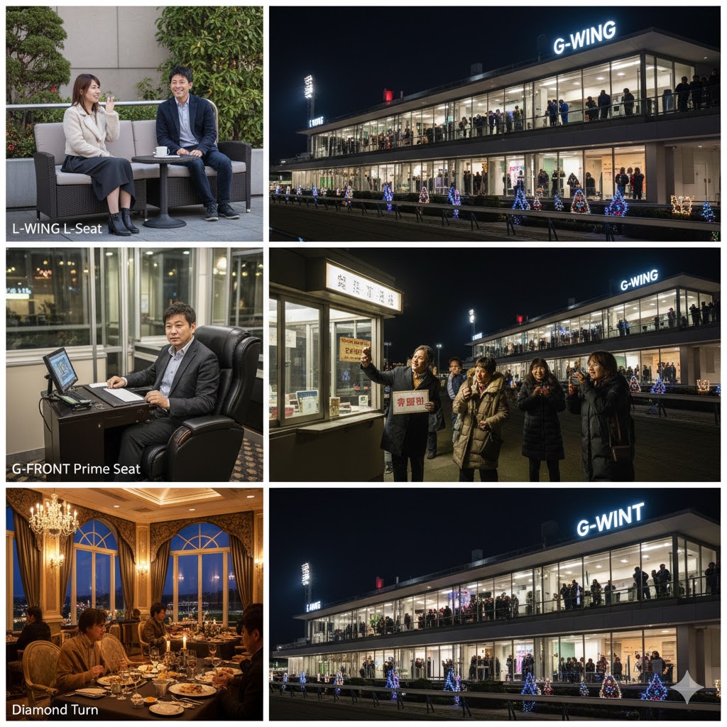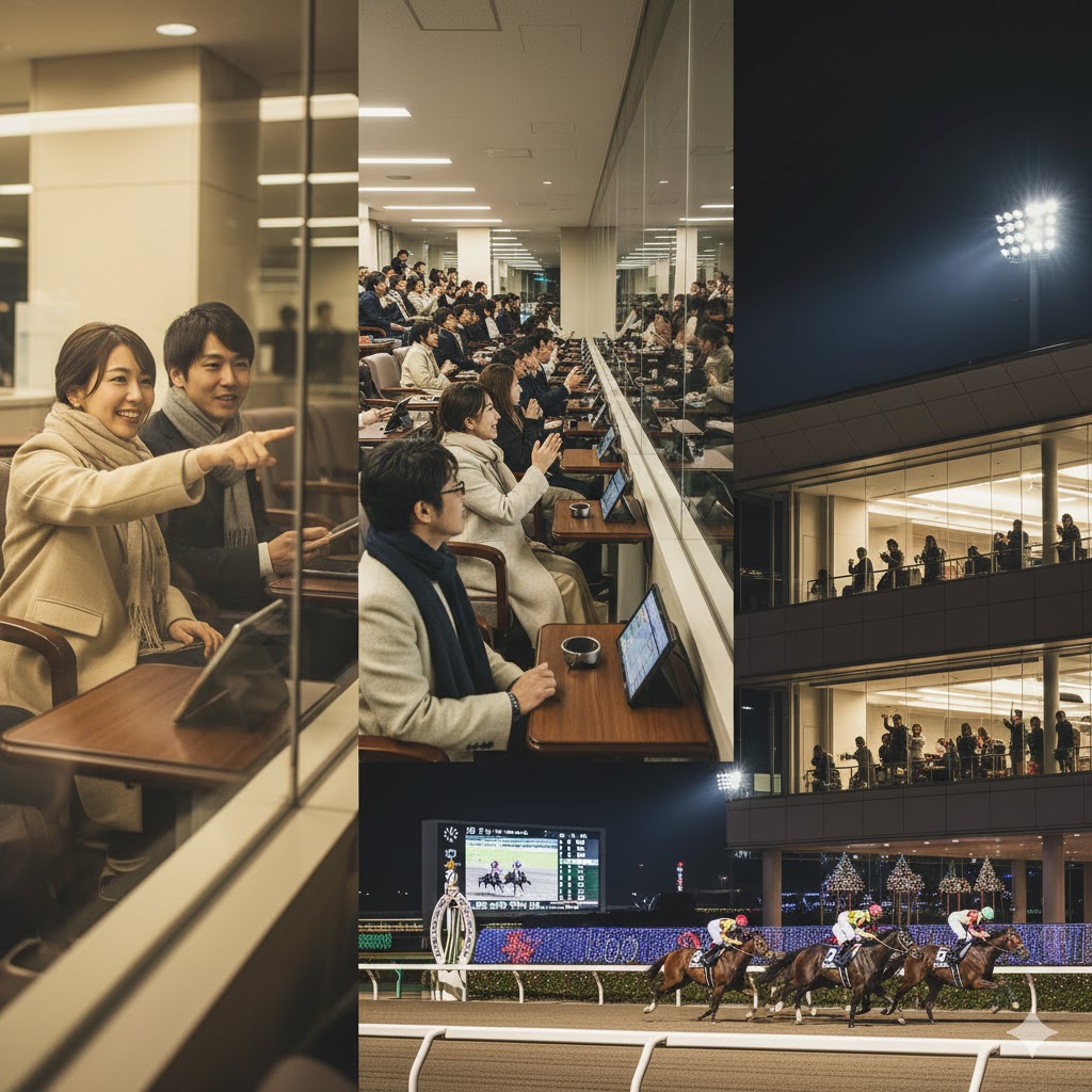 - ダイアモンドターン: 食事をしながら競馬を楽しめるレストラン。ビュッフェ形式の豪華な食事とドリンクが含まれており、特別な日の観戦に最適です。ただし、20歳未満は利用できません。